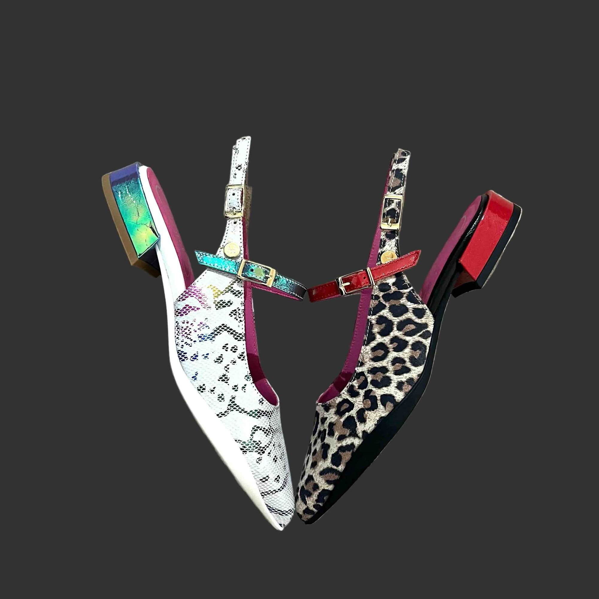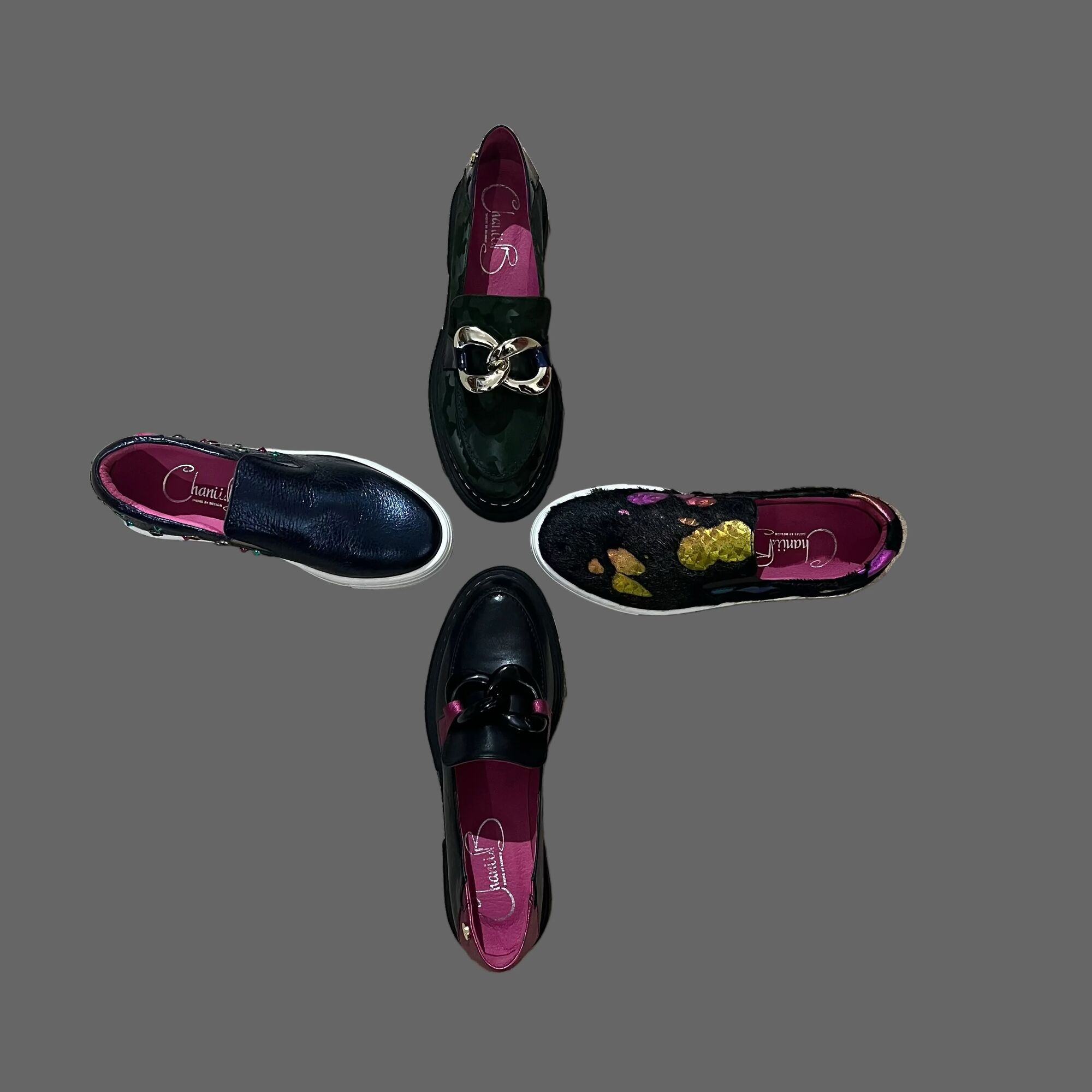 our favourite Scala has arrived in black rainbow cowhide and a new navy crack. Plus new colours in the Flambe loafer made on the Paris construction